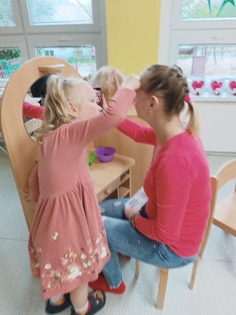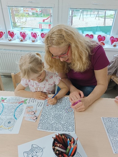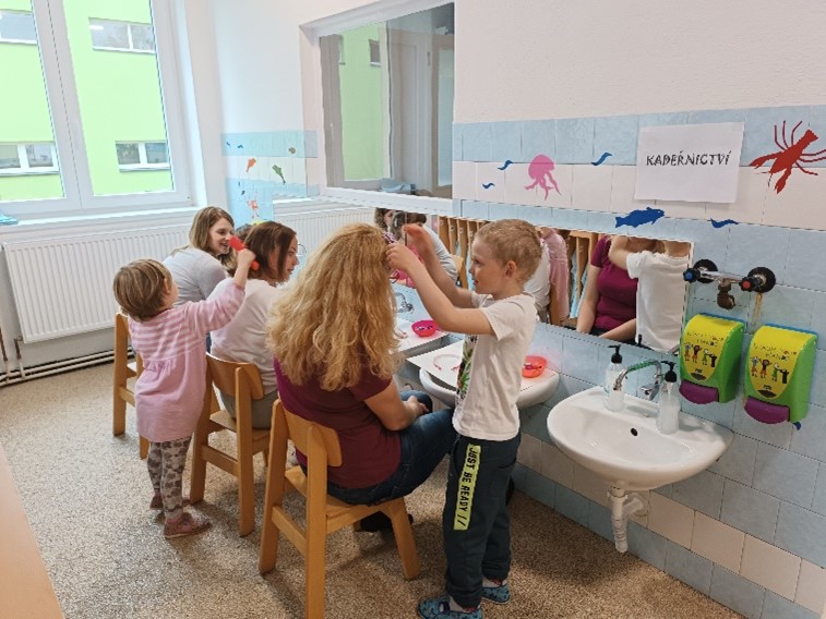 Byli pro ně nachystané koutky - kadeřnictví, kosmetika, manikúra, masáže zad a nohou, vířivka, antistresový koutek a cukrárna s kavárnou. Maminky s dětmi jednotlivé koutky procházely, nechaly se od dětí učesat, nalakovat nehty, namasírovat záda, prošly se po masážním koberci, vyzkoušely vířivku, společně vykreslily omalovánku a zašly si do cukrárny na kávu a zákusek. Na závěr děti maminkám předaly dáreček, který pro ně připravily – přáníčko a pampeliškový sirup. Odpoledne se vydařilo, maminky odcházely spokojené.