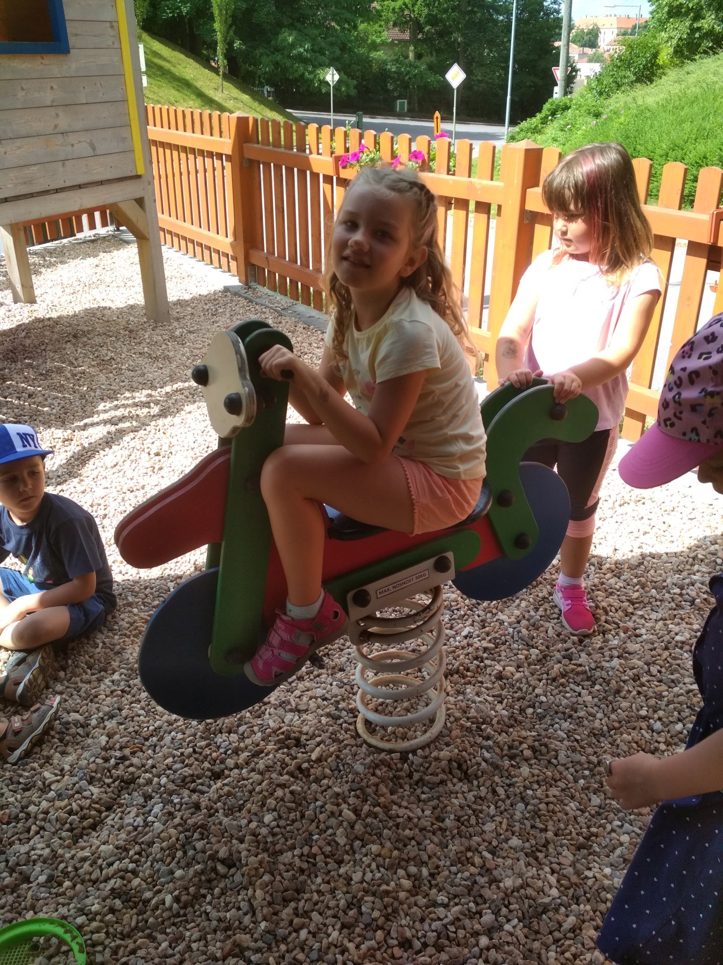 U školy je dětské hřiště s atrakcemi.