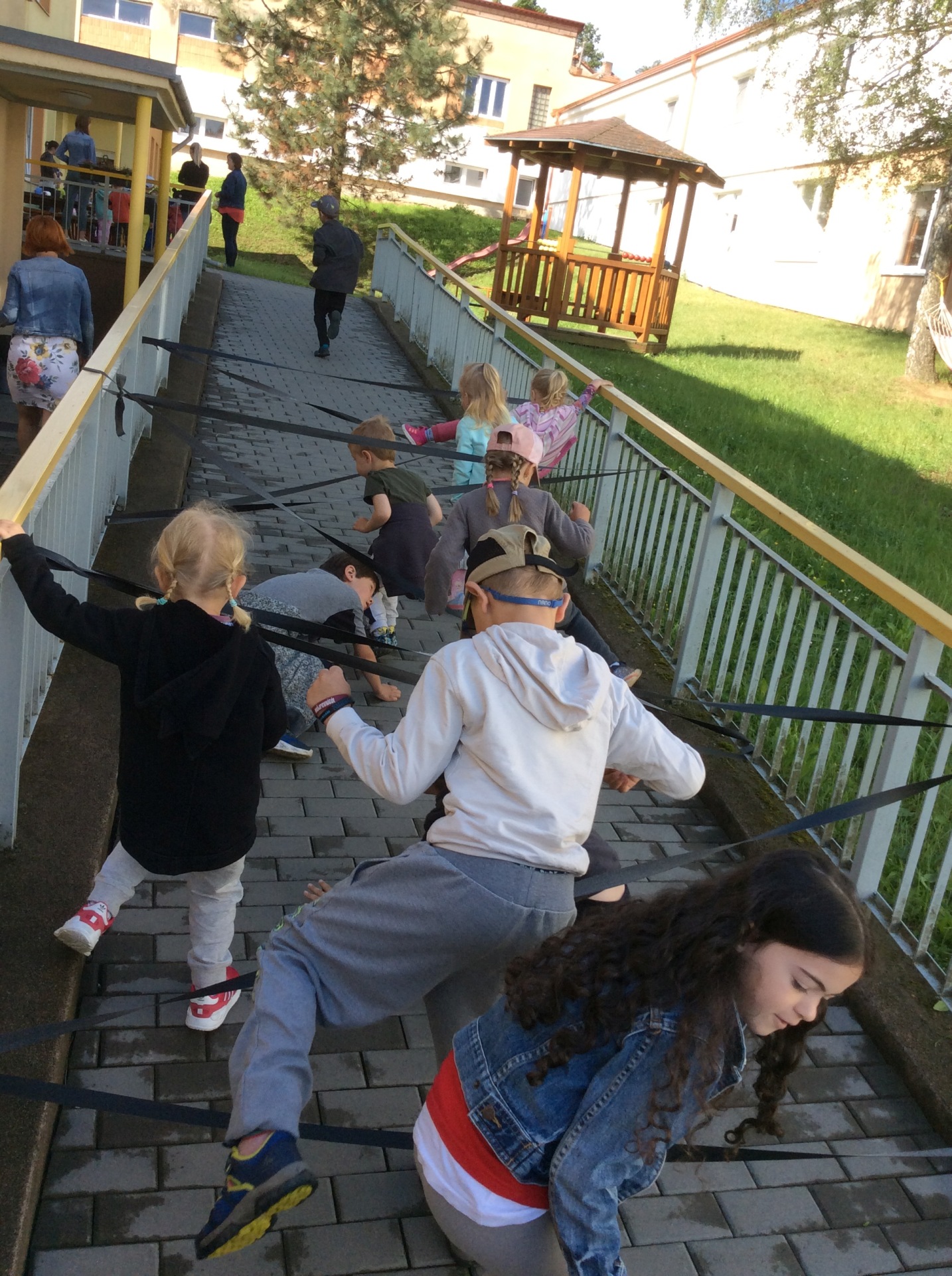 U školy je dětské hřiště s atrakcemi.