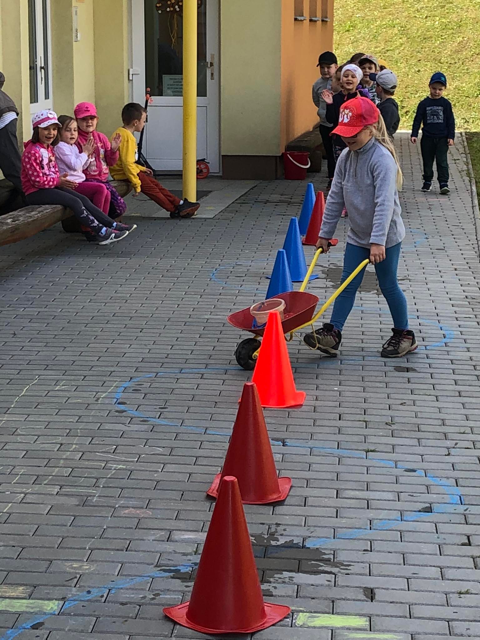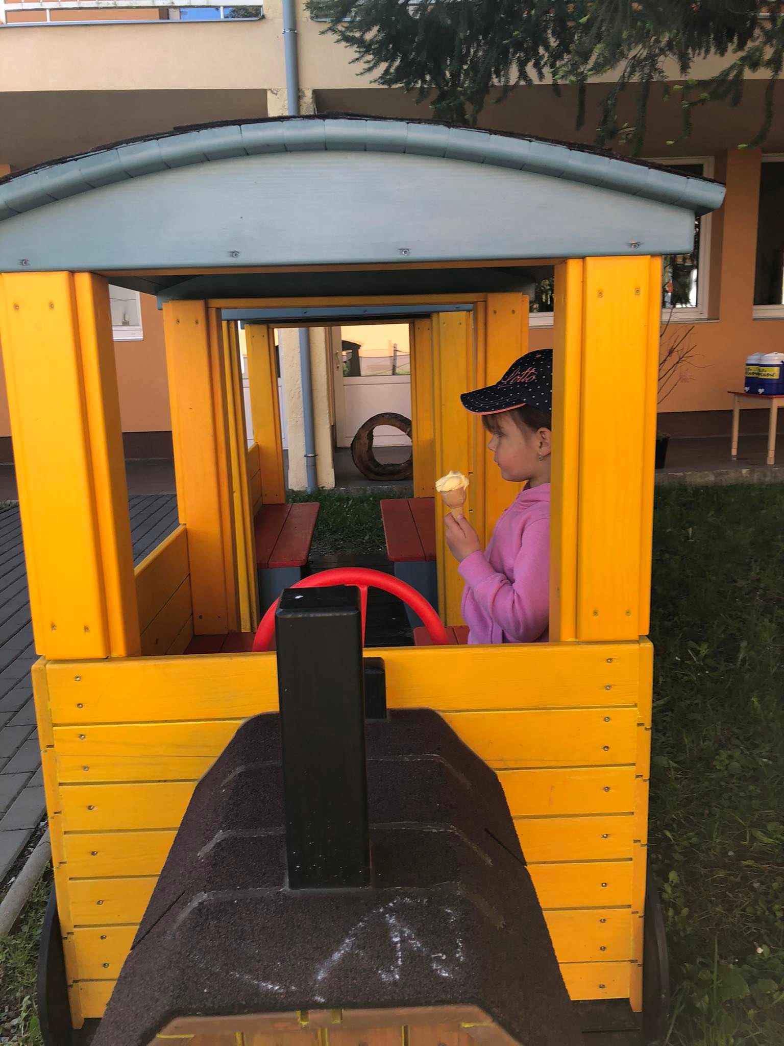 U školy je dětské hřiště s atrakcemi.