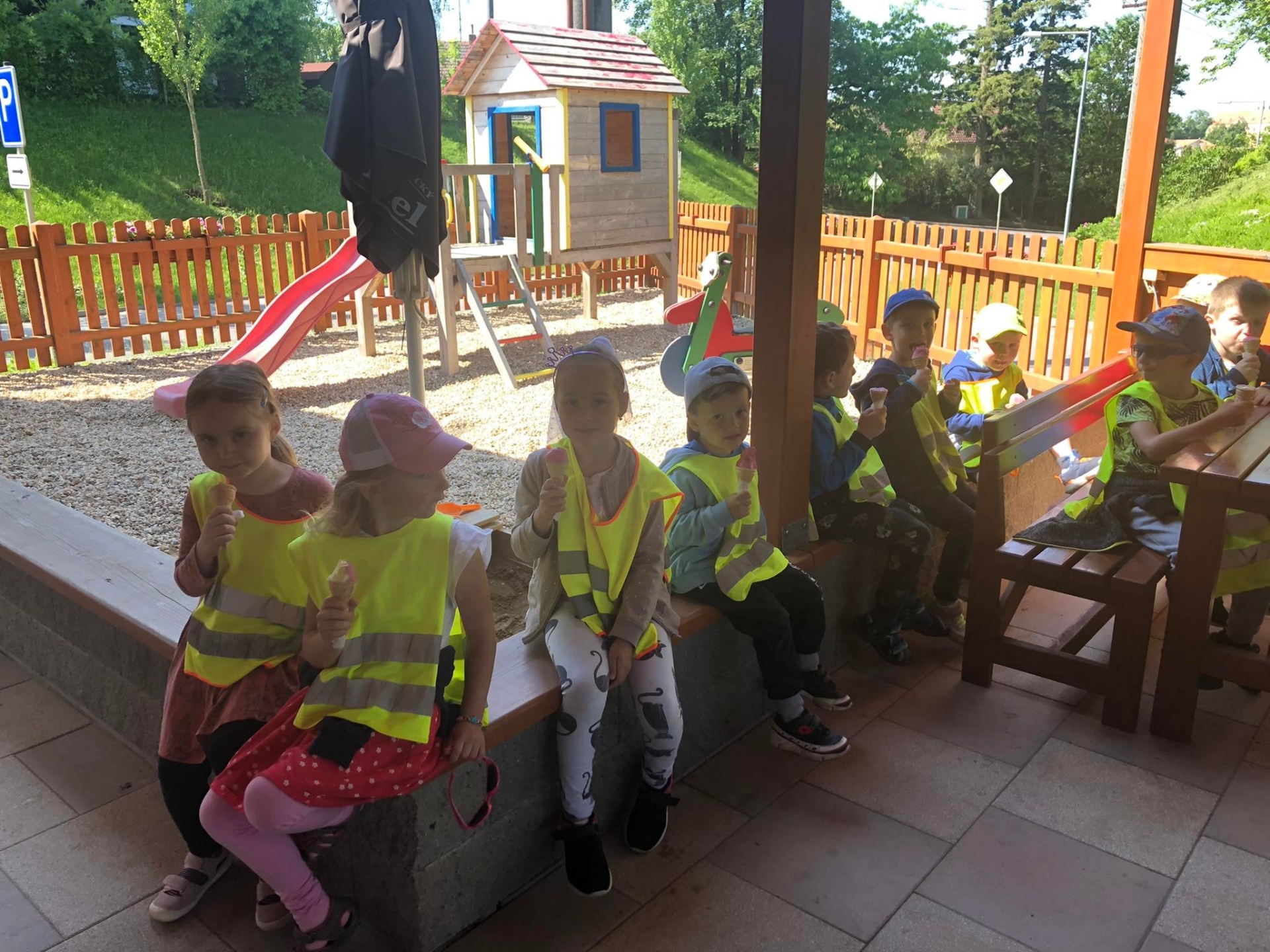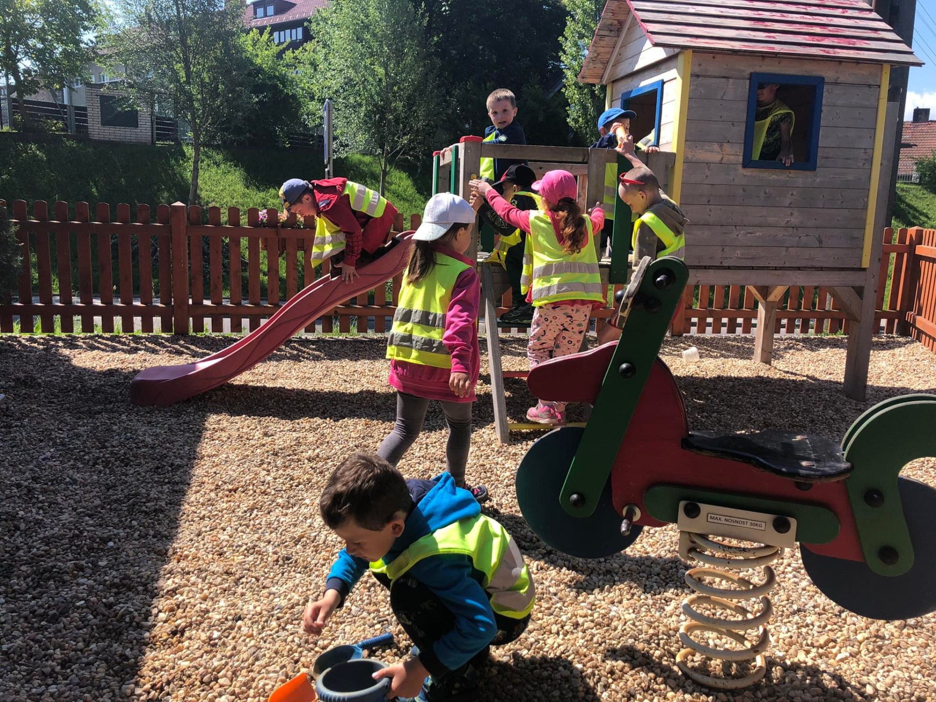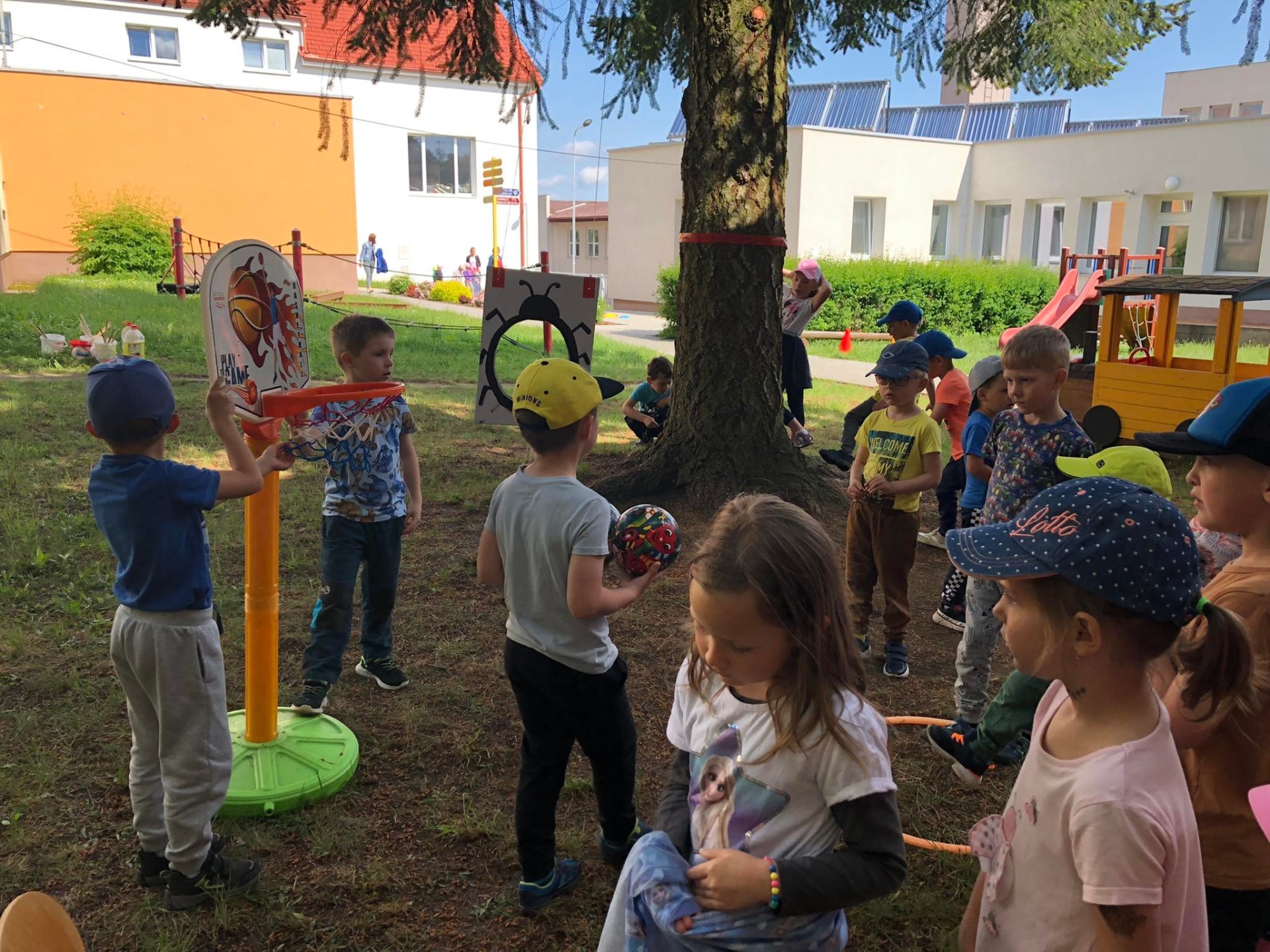 U školy je dětské hřiště s atrakcemi.